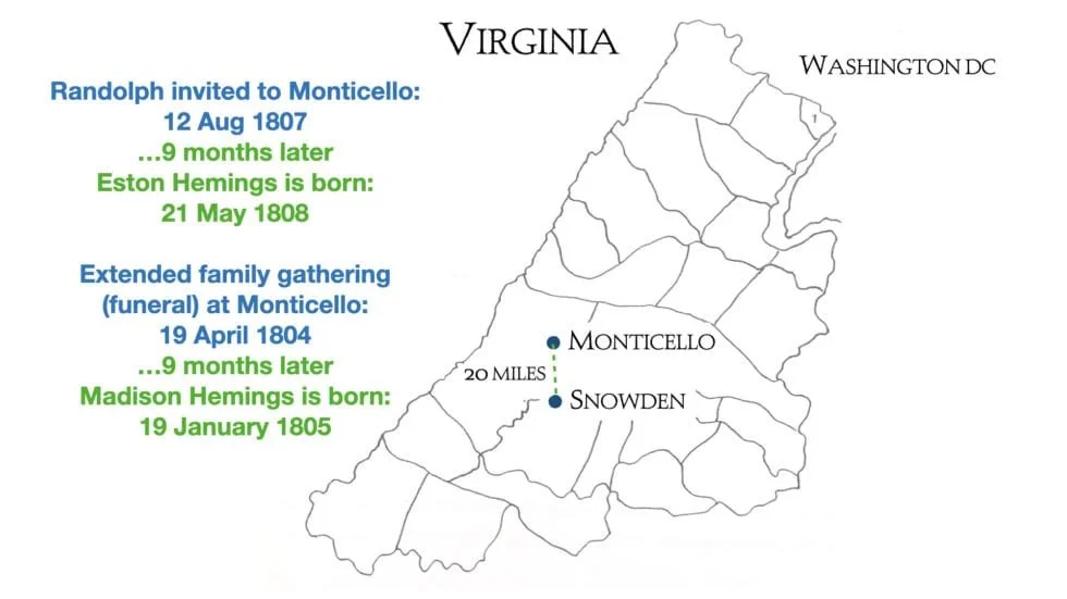 Randolph Jefferson lived in the vicinity at Snowden Farm, which was half a day’s horse ride from Monticello. When Thomas Jefferson was performing his governmental roles and living in New York, Philadelphia, and Washington DC, Monticello was usually kept locked up. Jefferson would always send advance word to his family that he was traveling south to visit Monticello, which prompted friends and relatives to flock to his Virginia home to see him upon his return. At times guests numbering more than 50 would stay for weeks. Therefore, whenever he would return to Monticello, all manner of friends and relatives would come to join him, particularly when Jefferson returned for the funeral of his daughter Maria in April of 1804, which also happened to be exactly 9 months before the birth of Madison Hemings, one of Sally Hemings’ sons and the older brother of Eston Hemings. With so many people visiting, there are almost no records of the comings and goings of his brother Randolph and his sons, the Carr brothers, or of any other close male relatives to Monticello. It is simply impossible to claim that Thomas Jefferson was alone at Monticello at any given time, and that none of the other 22 Jefferson males alive at the time also were present.
