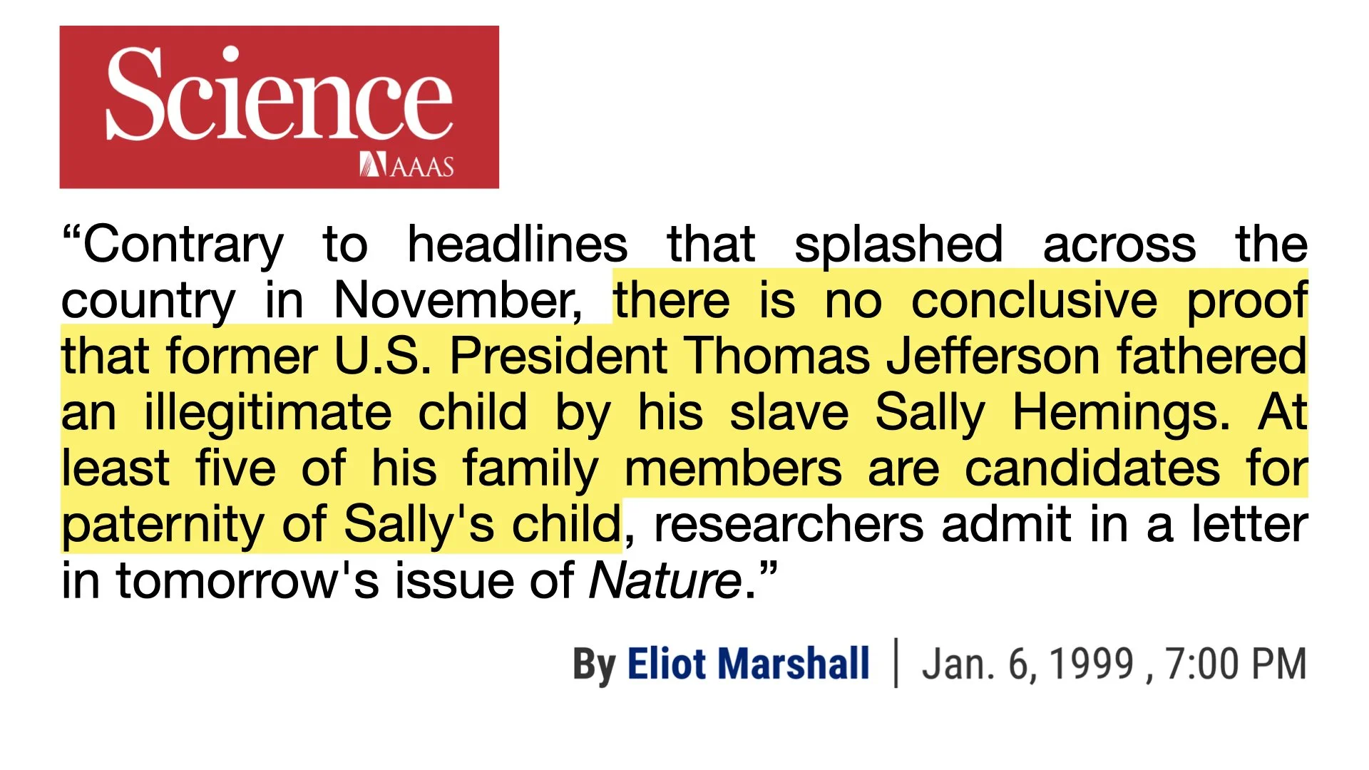 “Y chromosome data cannot be used to identify individual paternity within the Jefferson clan. That’s a job for historians,” Foster says. But that’s not how it sounded in the headlines on the initial Nature report and on an accompanying comment by geneticist Eric Lander of the Massachusetts Institute of Technology and historian Joseph Ellis of Mount Holyoke College in South Hadley, Massachusetts. The Foster article was titled: “Jefferson fathered slave’s last child,” and the comment included a heading that said: “Now, DNA analysis confirms that Jefferson was indeed the father of at least one of Hemings’ children”…. Nature staffer Rosalind Cotter agrees that “the whole thing really was rushed through.”