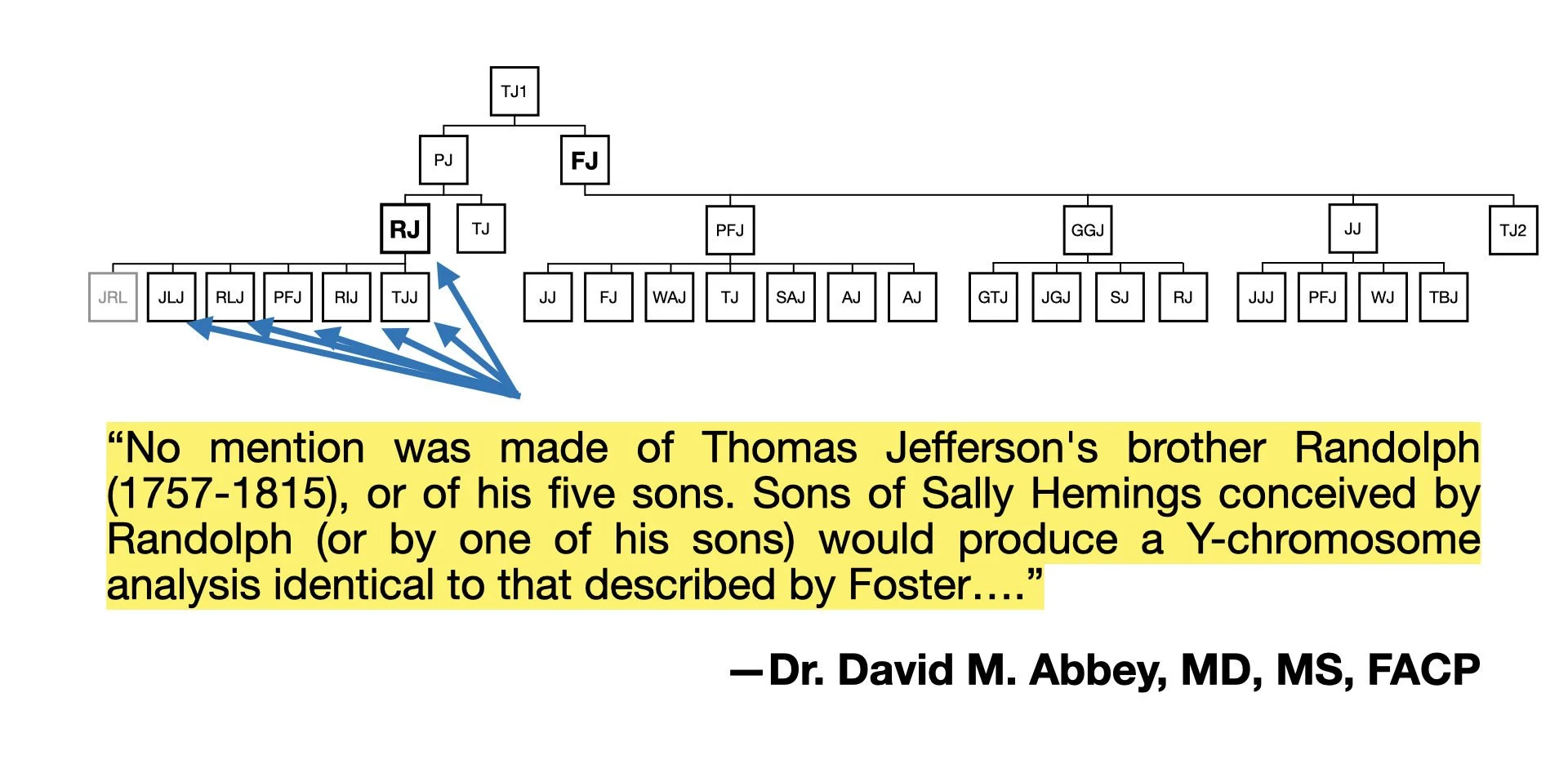 Although there were at least 22 Jefferson males alive at the time with the same y-DNA — eight of which lived nearby and were prime suspects for paternity — however Foster’s study did not mention any of them. In particular, it did not mention Jefferson’s younger brother Randolph Jefferson as a candidate for paternity, nor did he make an effort to locate DNA from his descendants. Randolph was Thomas’s nearest blood relative with five sons of his own who lived nearby to Monticello.