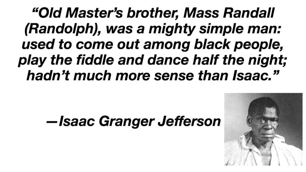 Of the Jefferson males, Randolph Jefferson in particular is a bit of an enigma and rarely appears in history books. In fact, what little is known of him comes from only a few sources, one of which is the Memoirs of a Monticello Slave by Isaac Granger Jefferson. In it he described Randolph as being much different than his brother Thomas: “Old Master’s brother, Mass Randall, was a mighty simple man: used to come out among black people, play the fiddle and dance half the night; hadn’t much more sense than Isaac.” In fact, a common description of Randolph was that he was impressionable, unaccomplished, and not very intellectually curious, which is perhaps why he was overlooked by the history books.