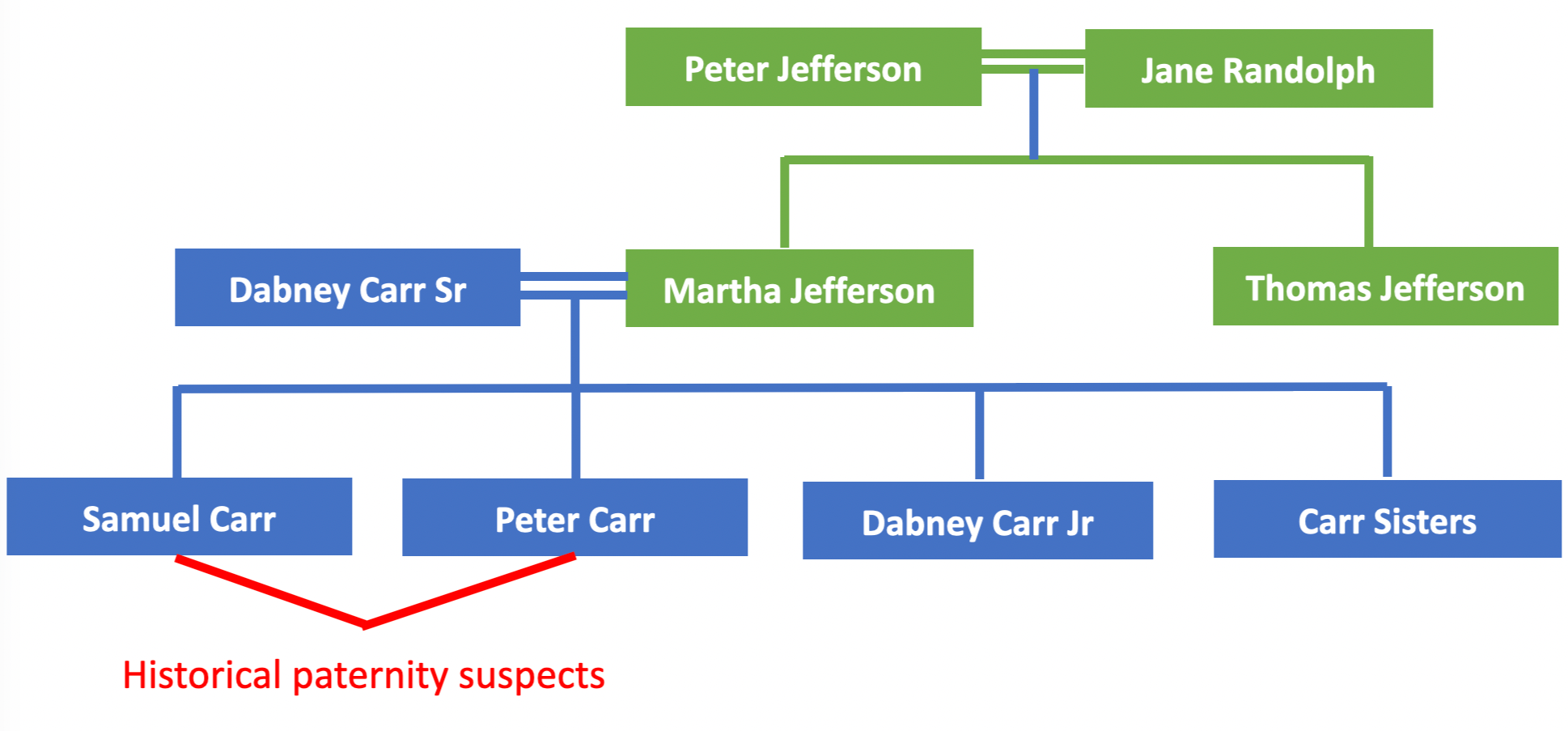 Historians had long pointed to the Carr brothers as prime suspects for paternity, particularly Peter Carr. In the 1998 study, the Carr male Y-DNA showed no match with Sally Hemings last son Eston Hemings, however it does not rule out that Peter Carr could have fathered previous children of Sally Hemings. According to the oral history passed down by Peter Carr descendants: “Peter Carr and Sally Hemings had a loving affair in her cabin on Mulberry Row and had all their children there. Their relationship lasted over a decade.”